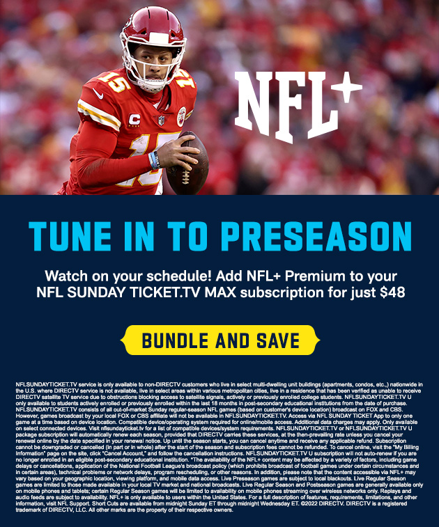 NFL+ IS ONLY AVAILABLE TO USERS WITHIN THE UNITED STATES. FOR A FULL DESCRIPTION OF FEATURES, REQUIREMENTS, LIMITATIONS, AND OTHER INFORMATION, VISIT NFL SUPPORT. |
